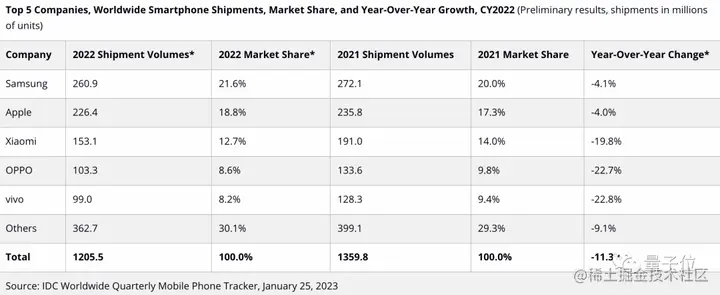 △2022年全年全球智能手机出货量前五,来源:IDC