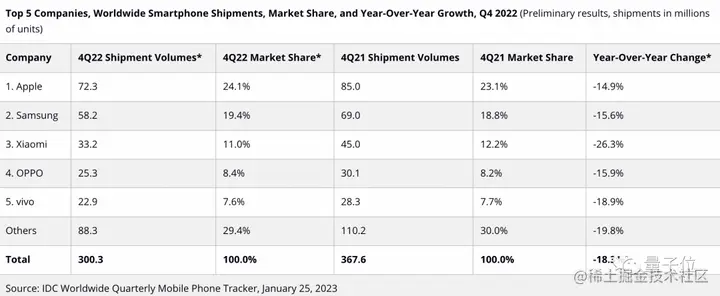 2022年第四季度(假日季度)全球智能手机出货量同比下降18.3%,为3.003亿部。