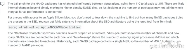 此外这位网友还给出了不用拆解电脑就能查看SSD中有多少NAND软件包的方法:使用ioreg工具,可以从Terminal获得关于SSD架构的相当广泛的信息:ioreg -lrw0 -d1 -c AppleANS3NVMeController。