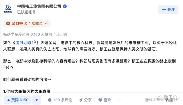 在知乎相关回答中,中国核工业集团有限公司顺着电影内容,延展科普了相关知识并披露了公司目前进展。