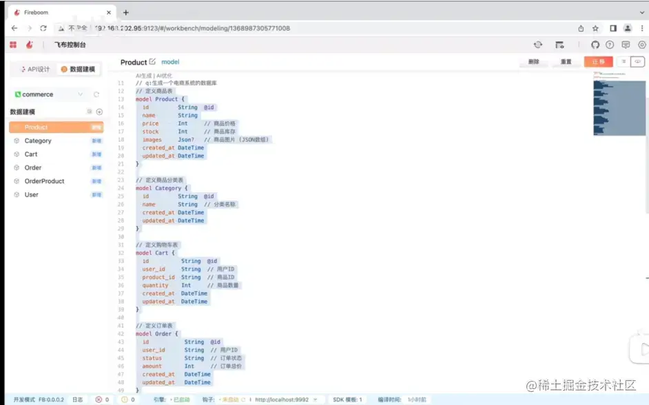 飞布教程06--AI辅助建模,30秒设计电商系统数据库 飞布API 2023-06-19 173 阅读1分钟 飞布集成了AI辅助建模能力,仅需30秒即可完成电商系统数据库设计,具体使用步骤如下: ①.打开数据建模界面,在数据建模的源码视图中输入“q:设计一个电商系统的数据库”,然后换行: 可以看到,AI很快生成了相应的电商系统的模型,甚至还包括外键关联。可以不断对话,优化生成的数据表。 确认模型没有问题后,点击“迁移”命令,即可完成数据库建模。
