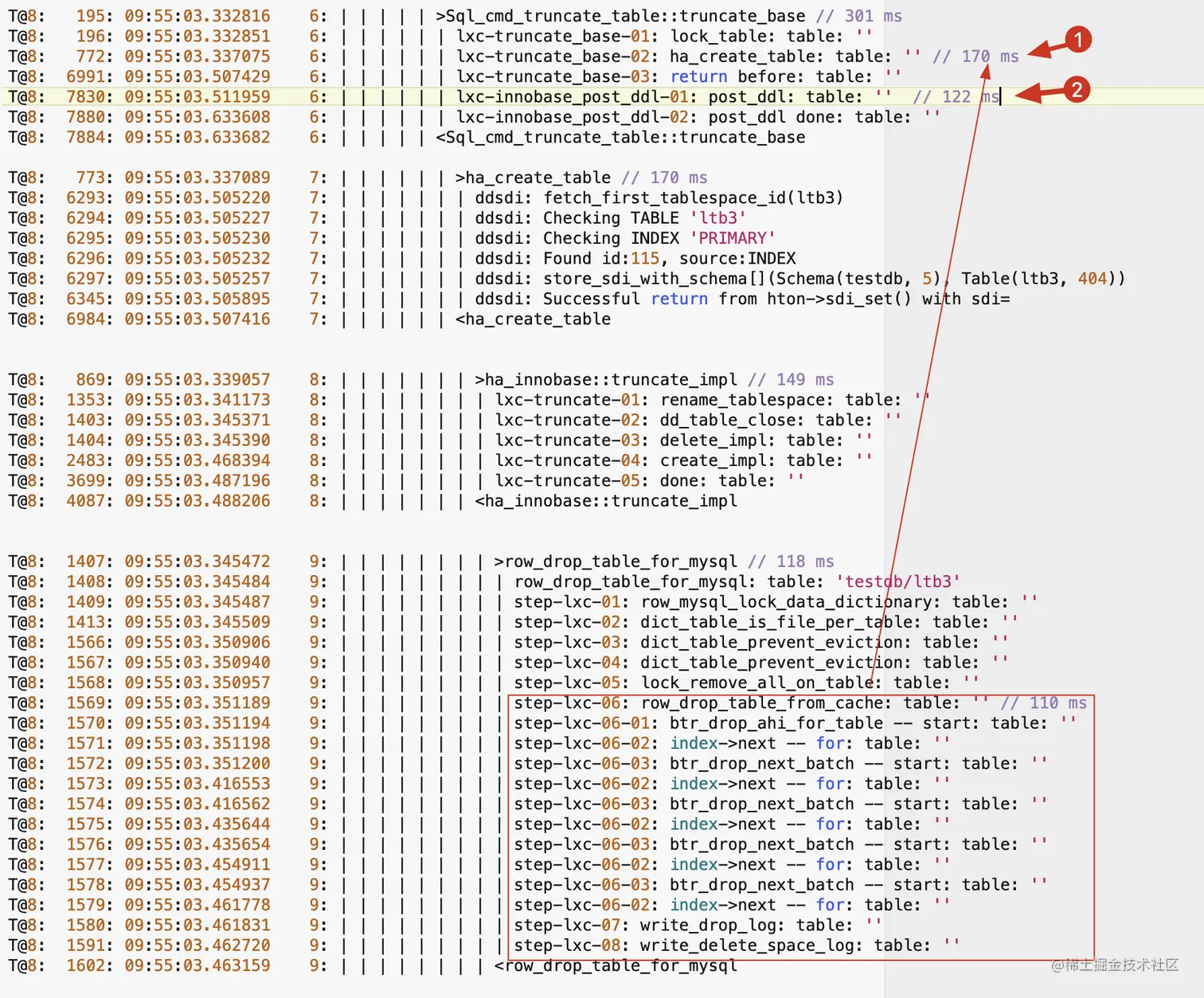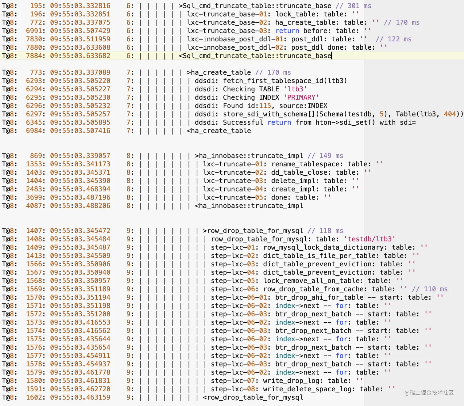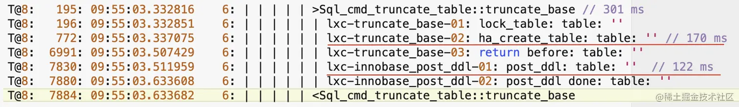 从 profile 结果来看,对于 truncate 语句,只能看到耗时过程都在System lock 上,无法看到更近一步的原因。