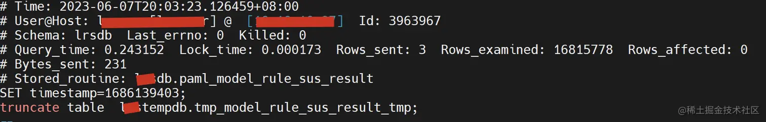 但是当 truncate 操作位于存储过程中时,在 truncate 操作之前有其它 DML 操作(如 insert selecct),这时候由于位于同一个 THD 下,在 MySQL 5.7 版本里面 thd->get_examined_row_count() 返回的结果其实是上一个 DML 语句的(这里应该是缺陷)。如果此时 truncate 操作的执行时间又超过了 long_query_time,那么此时这个 truncate 语句就会被记录慢查询。