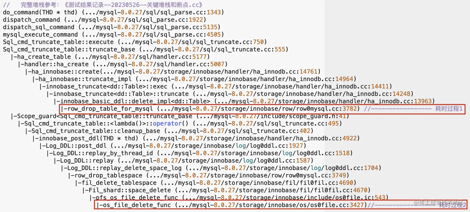 MySQL 5.7 的 truncate 和 drop 实现差异较大,整个实现过程几乎是完全独立的代码。truncate 使用 row_truncate_table_for_mysql,drop 使用 row_drop_table_for_mysql;truncate 操作的主要的耗时有 dict_drop_index_tree、os_file_truncate。