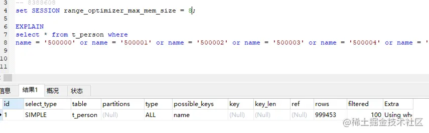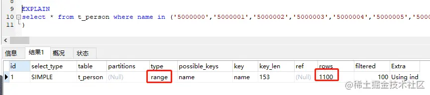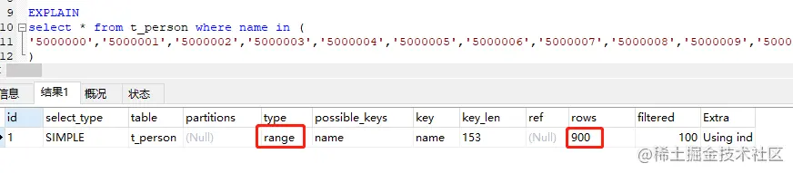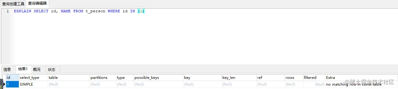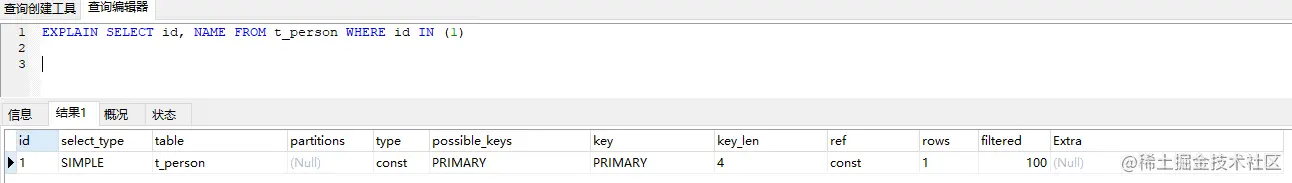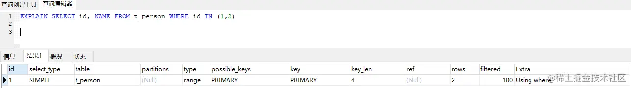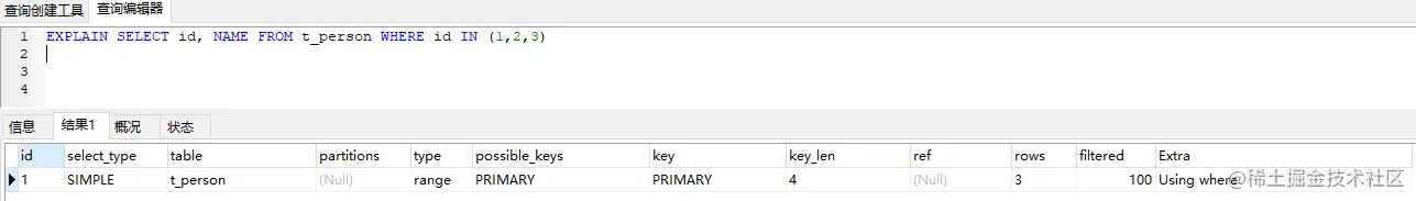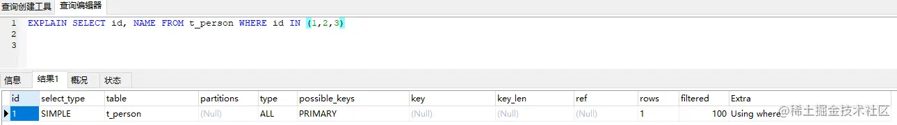 再使用sqlEXPLAIN SELECT id, NAME FROM t_person WHERE id IN (1, 2,3)