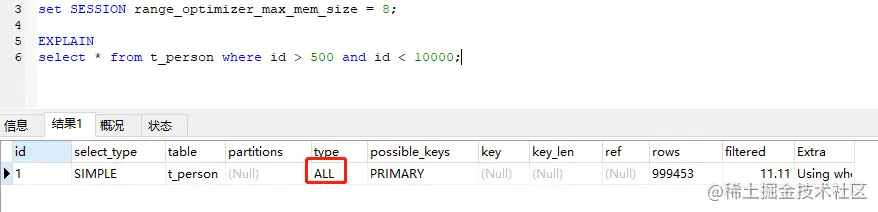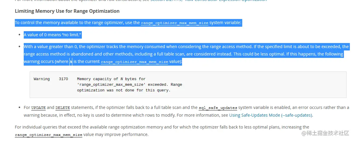 全表扫描。这可能不太理想。如果发生这种情况,会出现以下警告(其中N是当前的range_optimizer_max_mem_size值)。