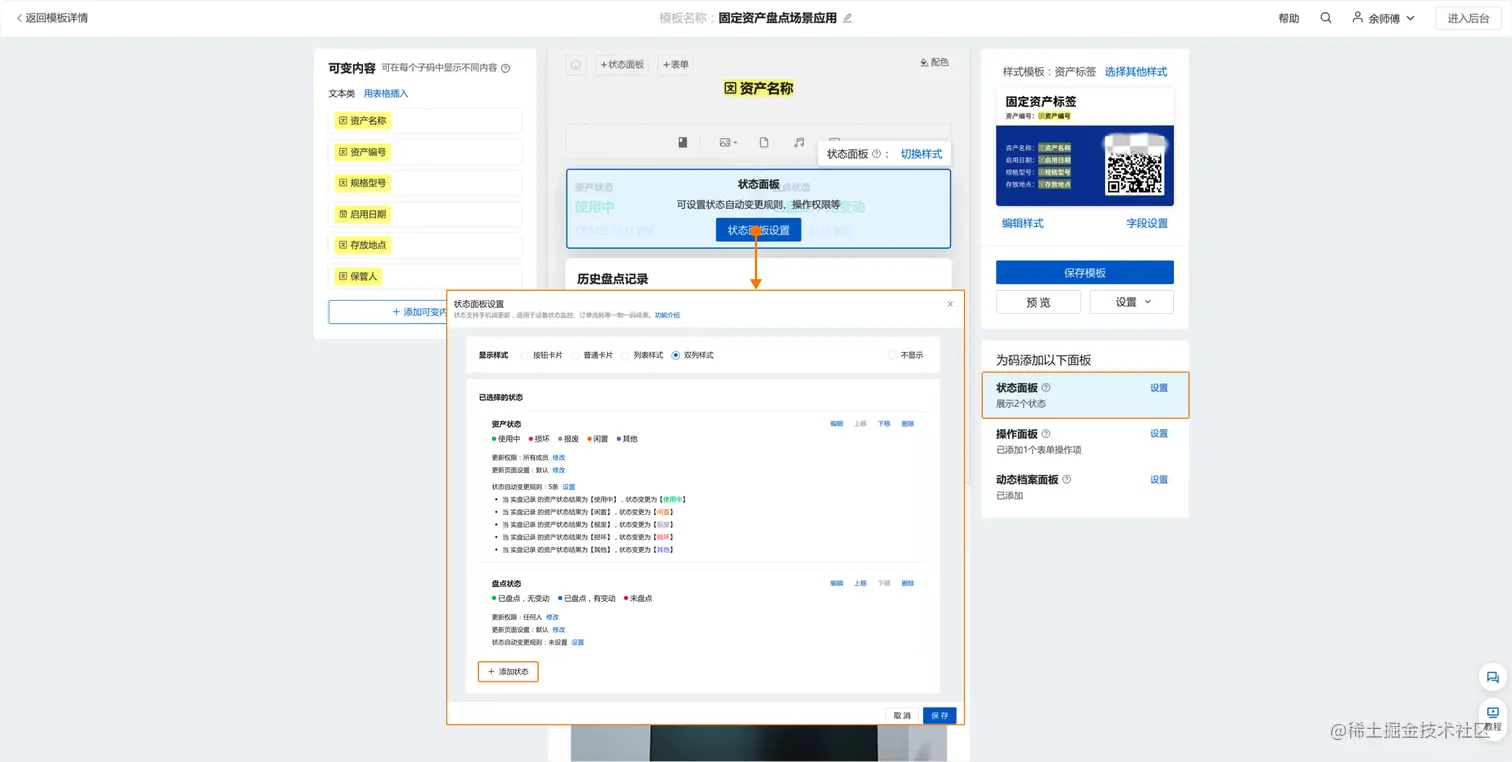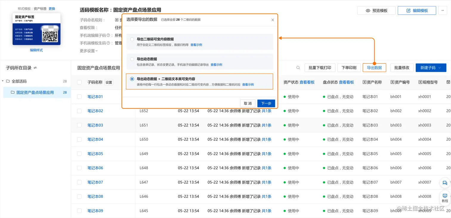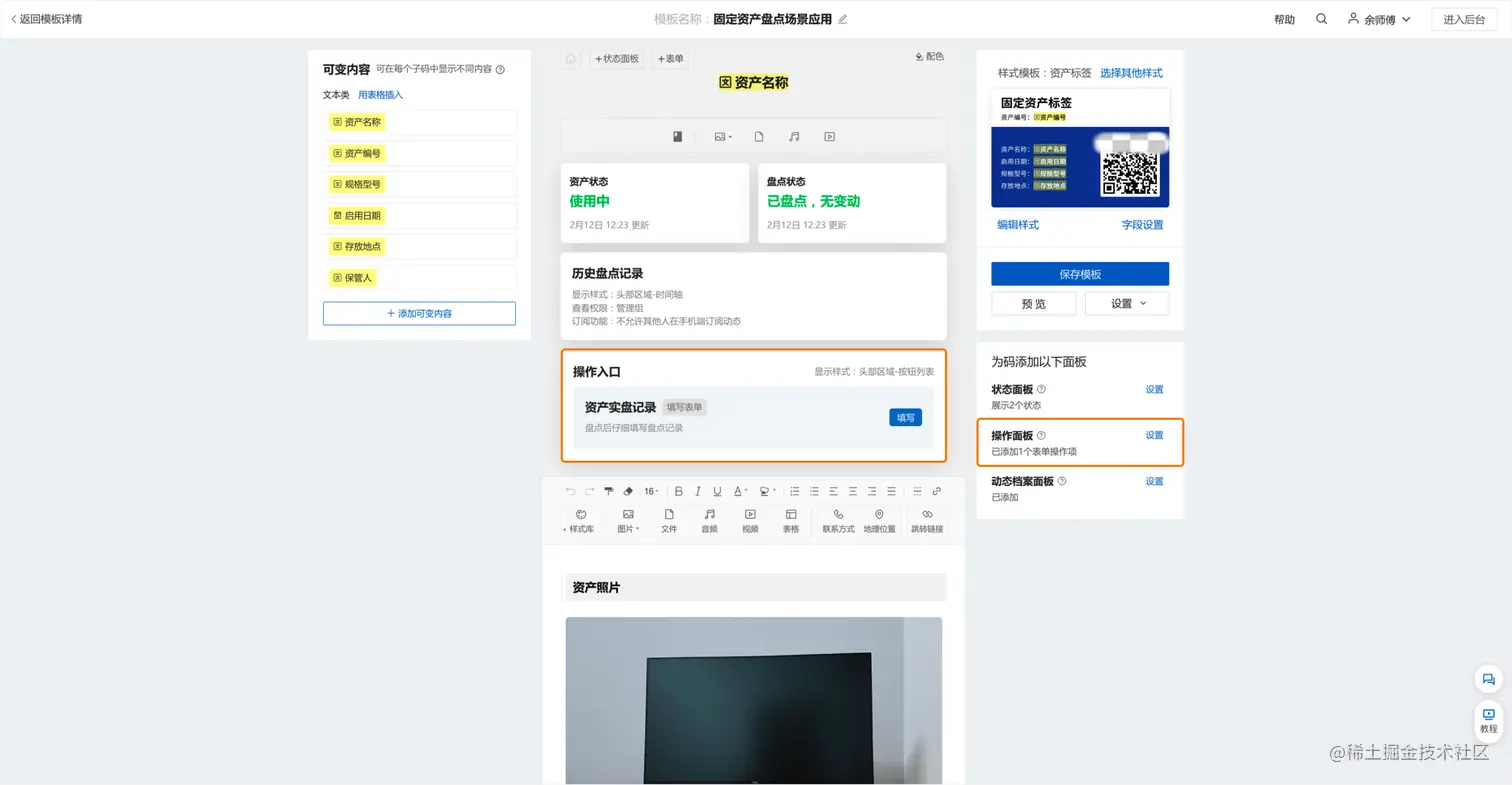 1、 管理员通过模板库建码或创建批量模板,上传资产清单 Excel表格批量生成资产标签二维码。在此基础上近一步修改批量模板,添加操作面板,并关联上实物盘点记录表单。