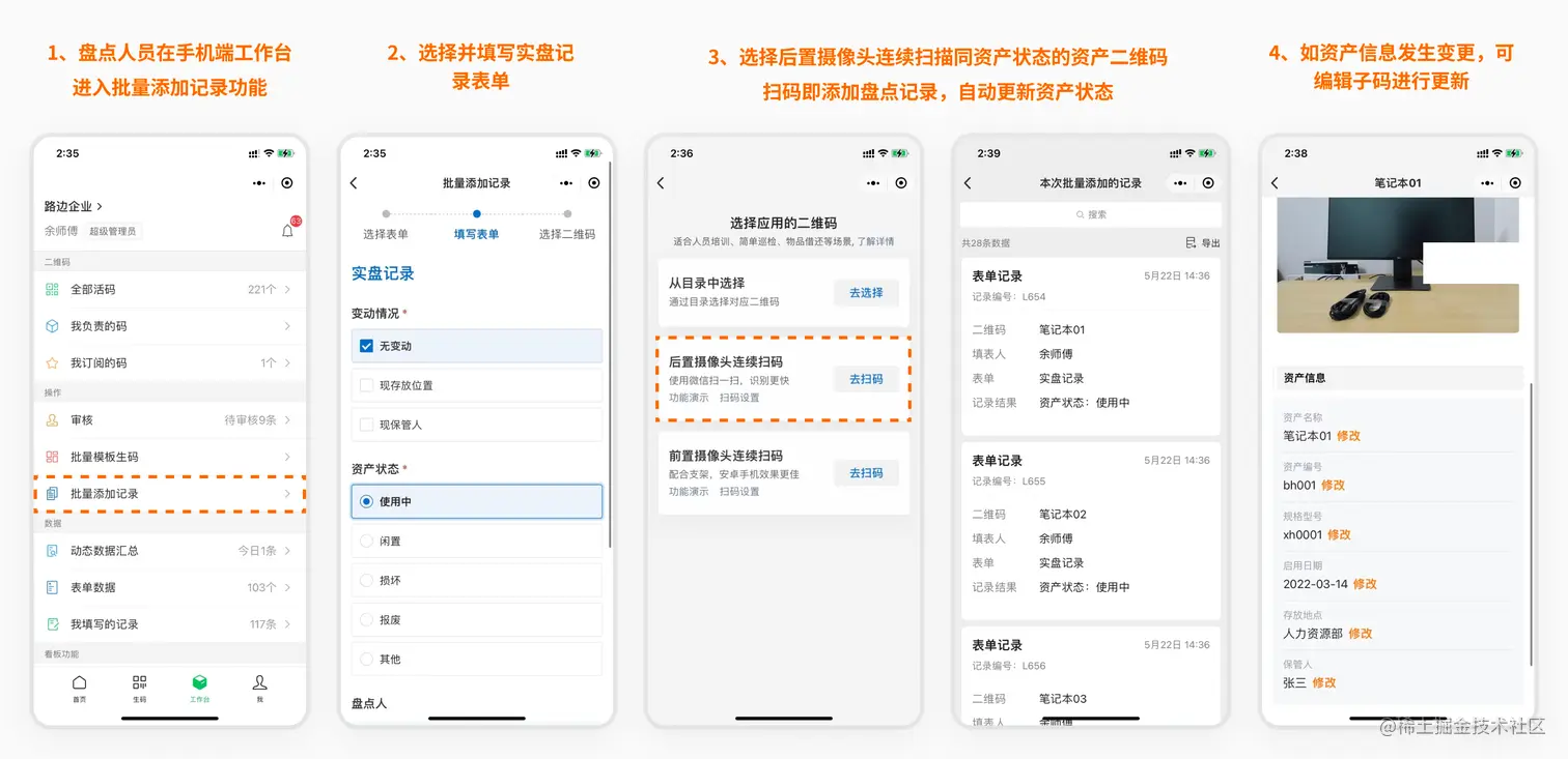 通过批量生成资产标签二维码,结合批量添加盘点记录功能,可在资产盘点场景中实现以下效果: