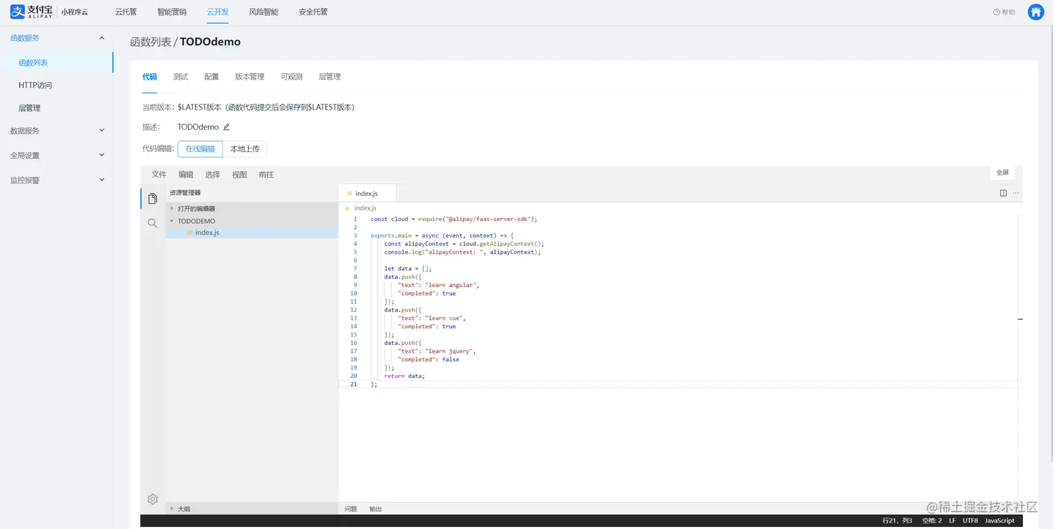 云开发提供了云函数完整生命周期管理,包含云端 IDE 开发、云端测试、运行环境配置,触发器管理,通过版本管理可以进行灰度流量发布,可观测提供了日志、指标、执行trace 监控信息。同时云开发提供安全防刷能力,防止非法攻击导致资源浪费。