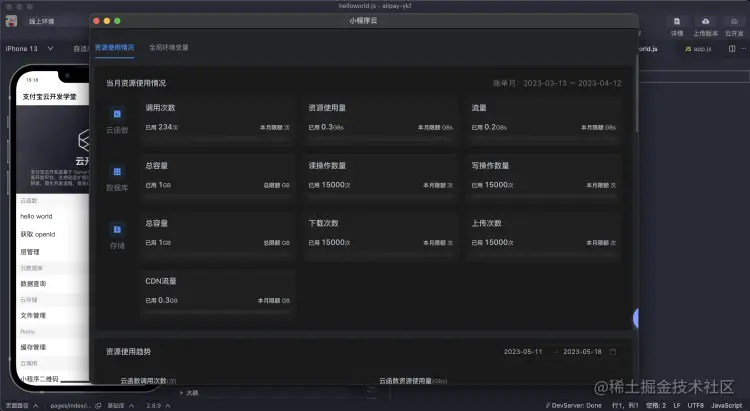 云开发提供了一套完整的小程序开发解决方案,包含开发的基础资源和一站式研发环境,通过云调用免鉴权使用支付宝生态 API