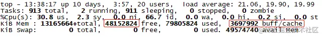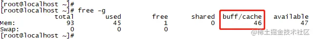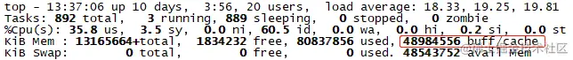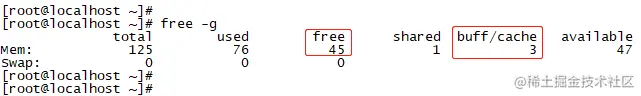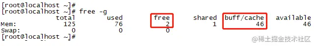 如下图1和图2所示,buffer/cache已经占用了46GB的内存,达到了整个系统内存的37%,这个占比已经非常高了。buffer/cache长期占用不释放,同时供系统上其它进程使用的可用内存几乎快没了。