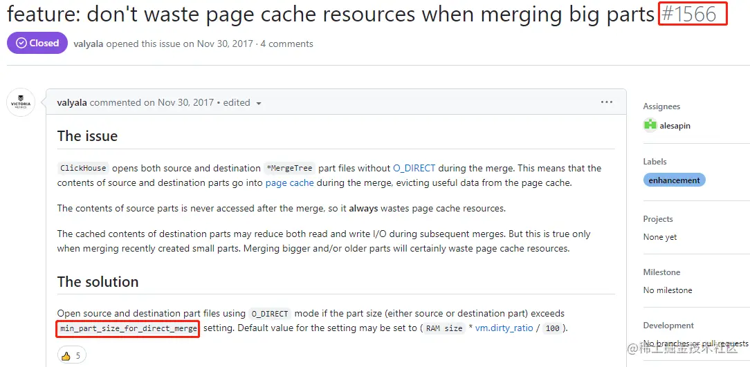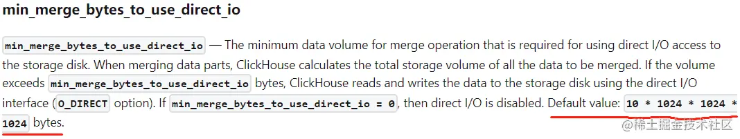 我们的clickhouse版本比较高,看社区记录,clickhouse官方将之前的min_part_size_for_direct_merge改成为min_merge_bytes_to_use_direct_io,Minimal amount of bytes to enable O_DIRECT in merge (0 - disabled)。默认超过10GB时会使用direct_io的方式进行merge。