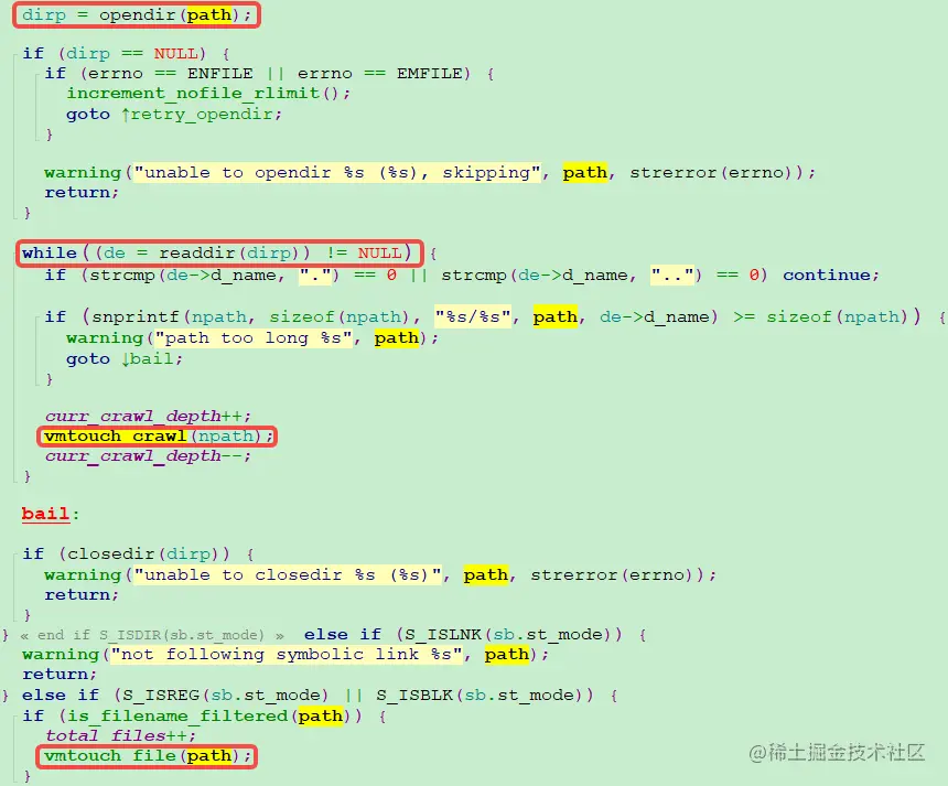 很好奇vmtouch实现指定目录内存清理的方法,去看了看源码,简单贴两张图就大致明白了。