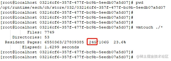 从哪开始调查呢?想起了lsof命令的执行结果,如前文图9所示的重要线索,clickhouse有大量时间都在打开目录:/opt/runtime/esch/ch/store/032/03216cf6-357f-477f-bc9b-5eedb07a5d07,判断该目录下面肯定有大量消耗cache的文件。直接进入该目录,继续使用vmtouch统计,不出所料,结果如下图所示,032目录就吃了24GB内存,心好痛啊。