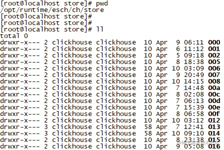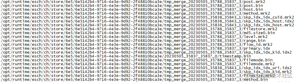 迫不及待的直接奔主题,看看clickhouse目录/opt/runtime/esch/ch/store下是什么,以及使用了多少cache。截取了该目录下的部分文件,内容如下图所示。