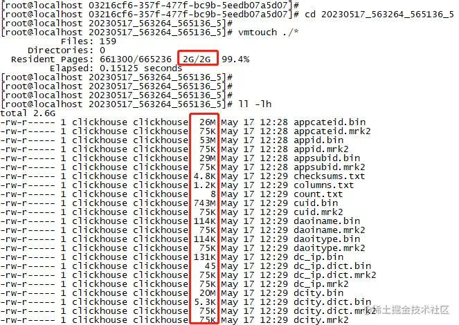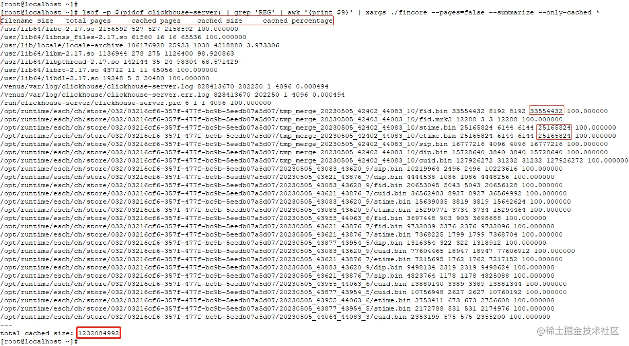 命令行: lsof -p (pidof clickhouse-server) | grep 'REG' | awk '{print 9}' | xargs ./fincore --pages=false --summarize --only-cached *