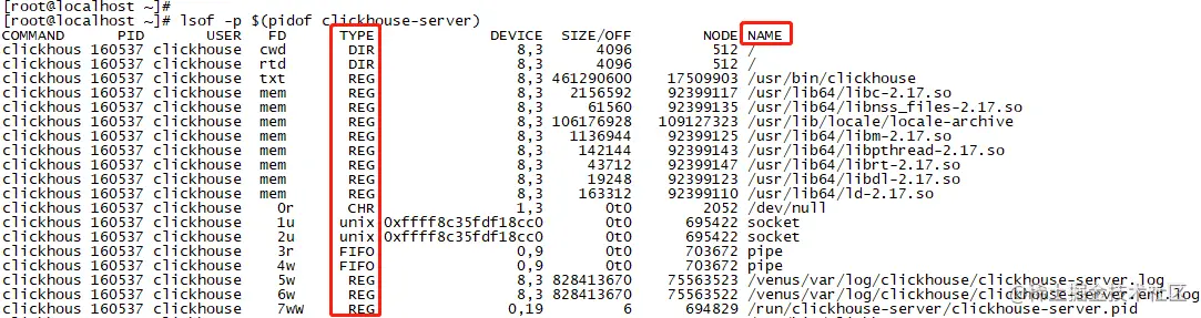 图8只截取了类型TYPE=REG(REG表示文件类型为普通,还有DIR为目录等等等),即截取了clickhouse当前打开,且正在使用的一部分类型为普通的文件。