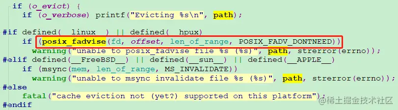 那vmtouch_file函数如何实现cache的释放操作呢?答案就是通过系统调用:posix_fadvise,并使用POSIX_FADV_DONTNEED宏。定义如下: