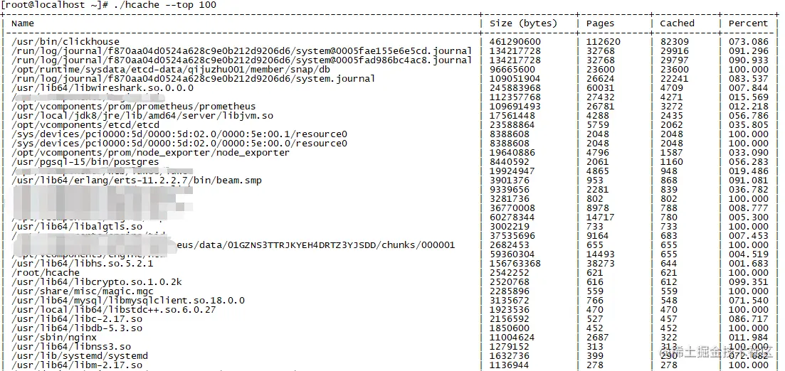 hcache还有一个能力,查看某个进程当前使用的cache。我们看看clickhouse的cache使用,结果如下图所示。