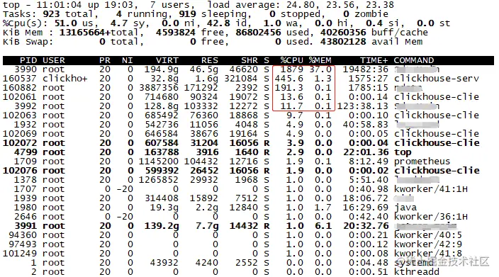 执行cache释放后,free从2GB变为了45GB,扩大了43GB;buffer/cache从46GB变为了3GB,减小了43GB。从cache释放了clickhouse的42GB+1GB其它程序占用的cache,说明我们环境上,clickhouse就是cache的消耗大户!老板沸不沸腾我不知道,反正我是沸腾了。