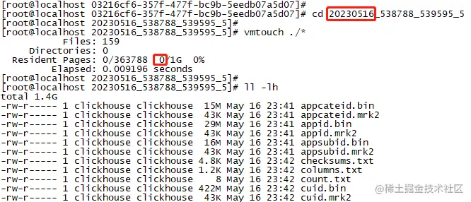我找了一个昨天的分区,可以发现昨天的分区目录里的文件是不再占用cache的。上一天的分区,clickhouse认为是合并完成的分区,已经不需要再进行合并了,自然就clear了cache的占用,开发者也是想到了的。