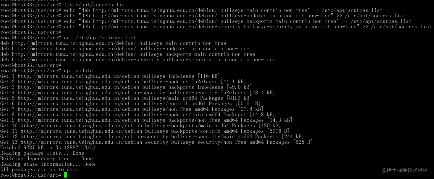 echo "deb http://mirrors.tuna.tsinghua.edu.cn/debian-security bullseye-security main contrib non-free" >> /etc/apt/sources.list
