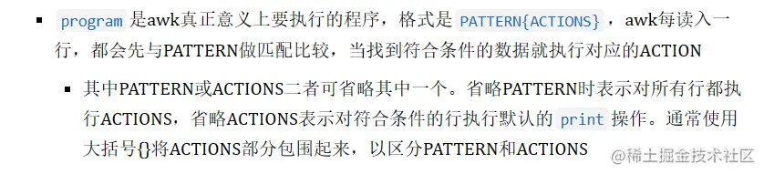 - 脚本(Script)组成指的是命令行中的program部分,可以成为awk代码也可以称为awk脚本,其格式为