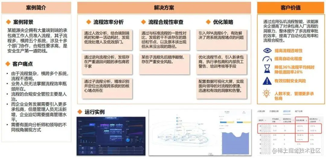 为解决这些问题,该企业引入了弘玑整合流程挖掘的超自动化解决方案,通过应用弘玑流程智能,该能源央企提高了对承包商入厂流程的洞察力,整体提升了多流程审批的效率,提高了自动化应用率和流程合规性。