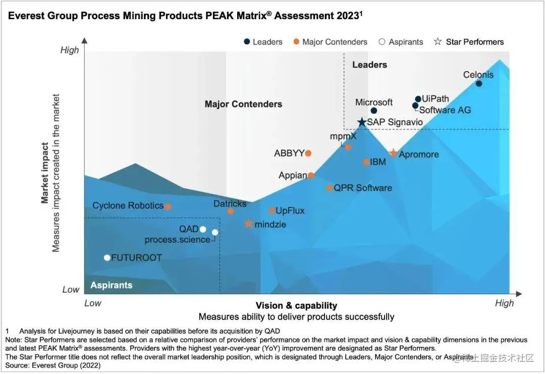 要了解全球市场格局,我们还可以参阅6月5日Everest Group发布的流程挖掘报告 PEAK MATRIX ASSESSMENT。