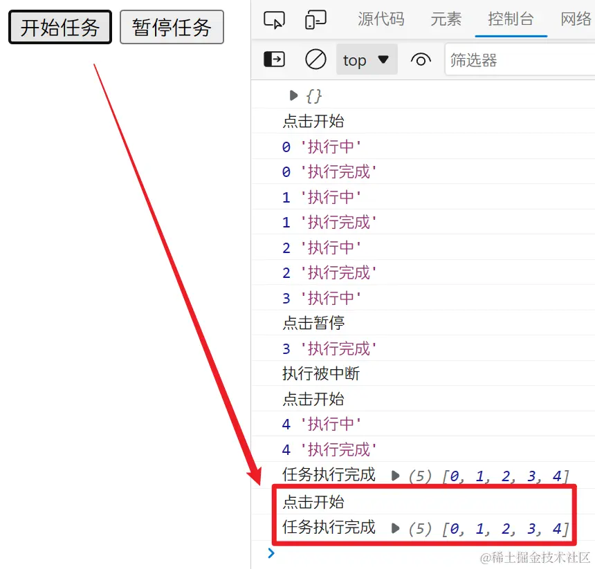 可以看出在任务 3 执行期间点击暂停,在任务 3 完成后,任务中断,再次点击开始,任务继续执行。