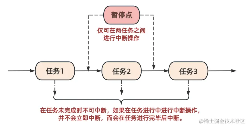 * 4. 每个任务具有原子性,即不可中断,只能在两个任务之间中断