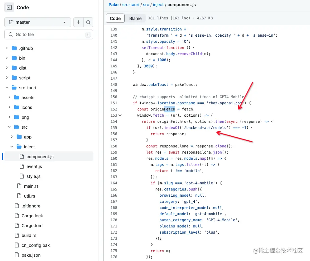 它通过覆盖默认的 fetch 方法,往返回的结果中注入了 GPT-4-mobile 模型。