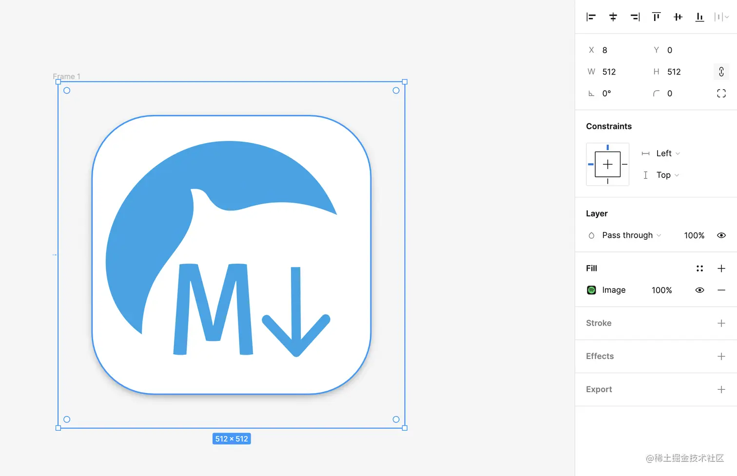 我们可以在 figma 中建立一个 frame 大小是512*512,中间的底色大小是412*412,圆角弧度是90, 导出 2 倍尺寸 png 就可以了。中间的底色大小和圆角不是固定值,可以自行设计。