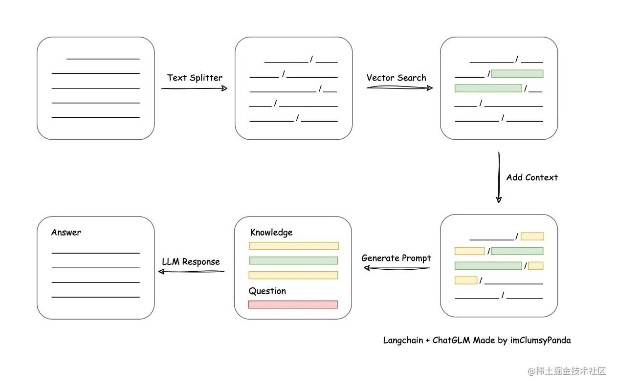 实现过程:包括加载文件 -> 读取文本 -> 文本分割 -> 文本向量化 -> 问句向量化 -> 在文本向量中匹配出与问句向量最相似的top k个 -> 匹配出的文本作为上下文和问题一起添加到prompt中 -> 提交给LLM生成回答。