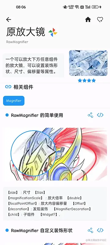 下面来简单使用一下:案例中通过 Stack 将 Image 和 RawMagnifier 叠放在一起,并且居中对齐。可以看到 RawMagnifier 组件的展示内容是对应图片位置的局部放大图。是不是用起来非常简单,就能实现很酷的效果: