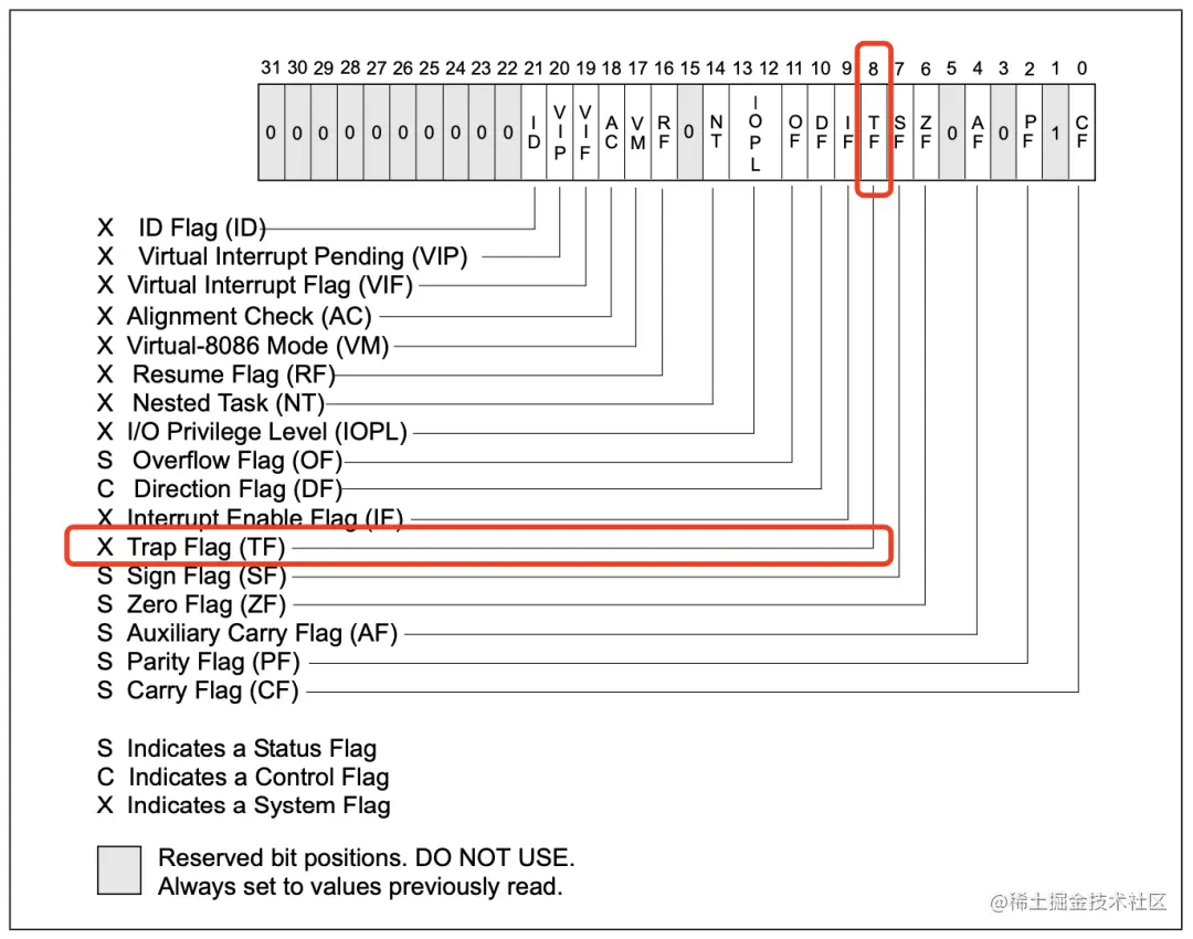 其中就有一个TF标记,用来告诉CPU进入单步执行模式,只要把这个标记为设置为1,CPU每执行一条指令,就会触发一次调试异常,调试异常的向量号是1,所以触发的时候,都会取出IDT中的1号表项中的处理函数来执行。