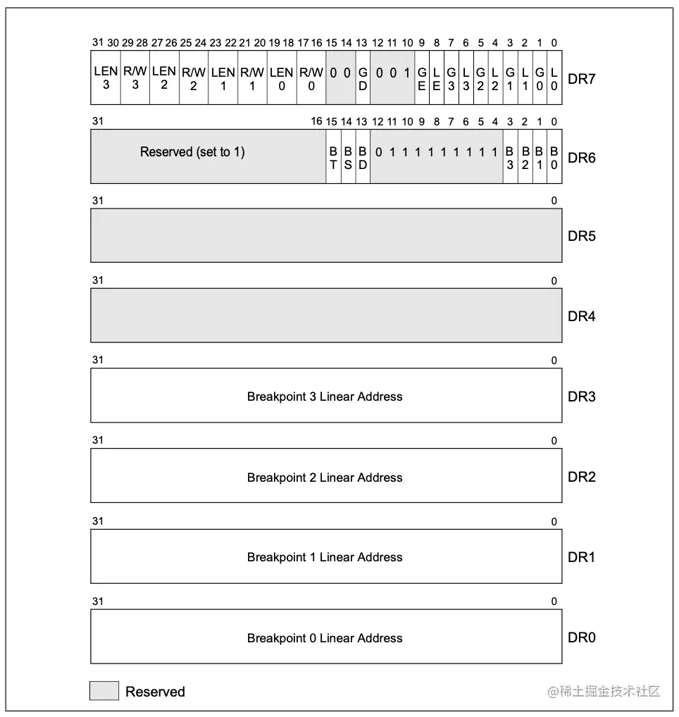 在x86架构CPU的内部内置了一组调试寄存器,从DR0到DR7,总共8个。通过在DR0-DR3中设置要监控的内存地址,然后在DR7中设置要监控的模式,是读还是写,剩下的交给CPU就好了。