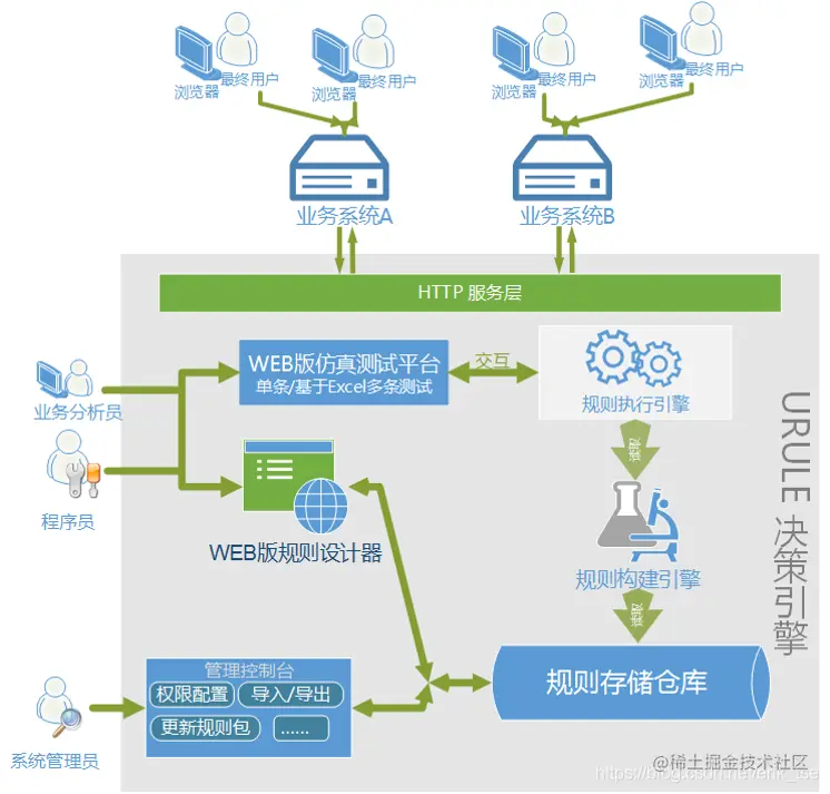 因此需要有一种解决方案将商业决策逻辑和应用开发者的技术决策分离开,在系统运行时能去更新管理业务规则。