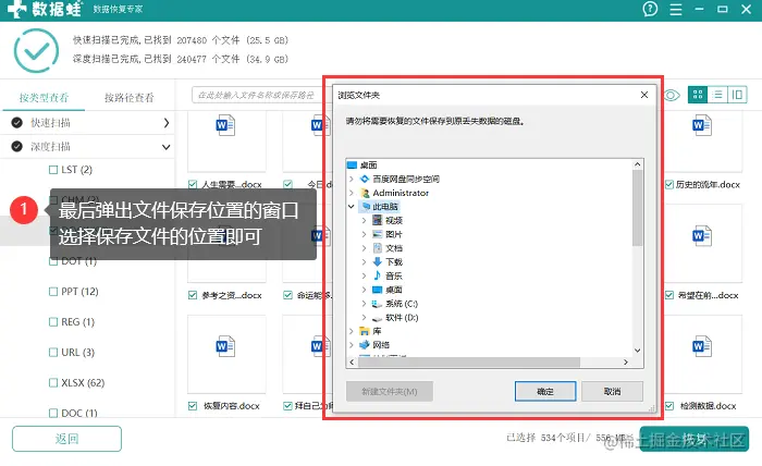 第4步:选择文件恢复后保存的位置(注意不要选择c盘)。