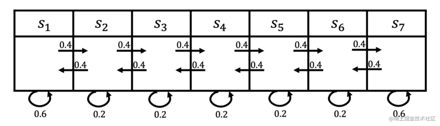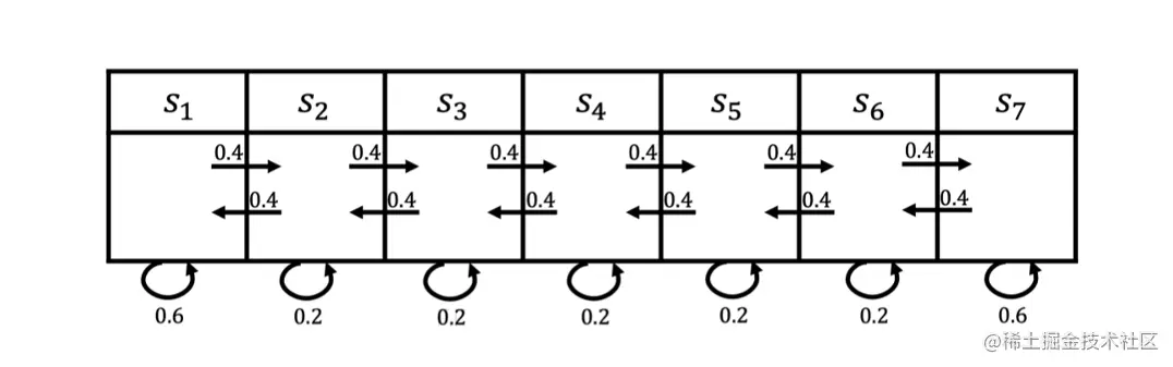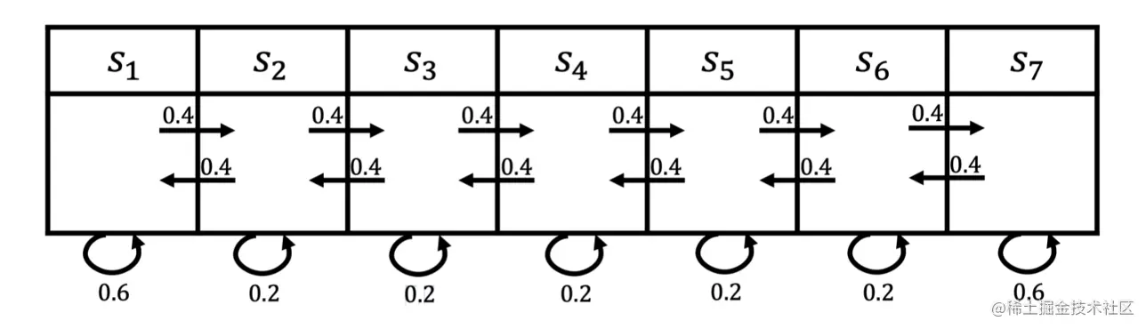 图 2.2 所示为一个马尔可夫过程的例子,这里有七个状态。比如从 s 1 s_1 s 1 开始,它有0.4的概率到 s 2 s_2 s 2 ,有 0.6 的概率留在当前的状态。 s 2 s_2 s 2 有 0.4 的概率到s 1 s_1 s 1 ,有 0.4 的概率到 s 3 s_3 s 3 ,另外有 0.2 的概率留在当前状态。所以给定状态转移的马尔可夫链后,我们可以对这个链进行采样,这样就会得到一串轨迹。例如,假设我们从状态 s 3 s_3 s 3 开始,可以得到3个轨迹: