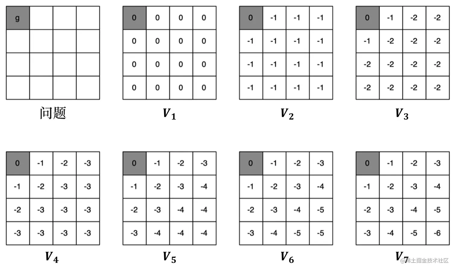 价值迭代做的工作类似于价值的反向传播,每次迭代做一步传播,所以中间过程的策略和价值函数 是没有意义的。而策略迭代的每一次迭代的结果都是有意义的,都是一个完整的策略。图 2.23 所示为一个可视化的求最短路径的过程,在一个网格世界中,我们设定了一个终点,也就是左上角的点。不管我们在哪一个位置开始,我们都希望能够到达终点(实际上这个终点在迭代过程中是不必要的,只是为了更好地演示)。价值迭代的迭代过程像是一个从某一个状态(这里是我们的终点)反向传播到其他各个状态的过程,因为每次迭代只能影响到与之直接相关的状态。
