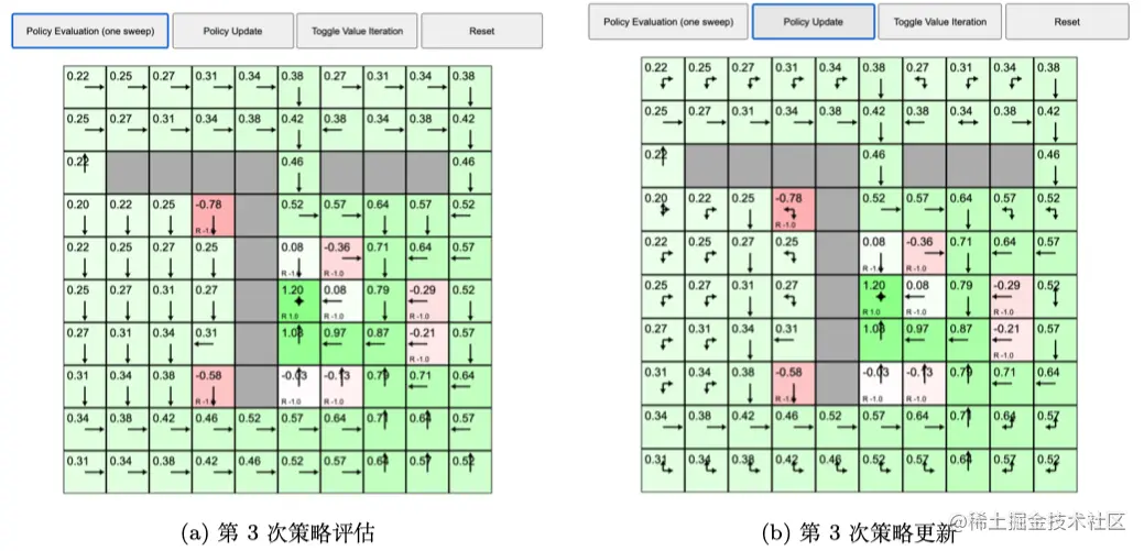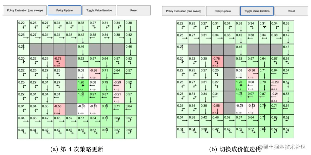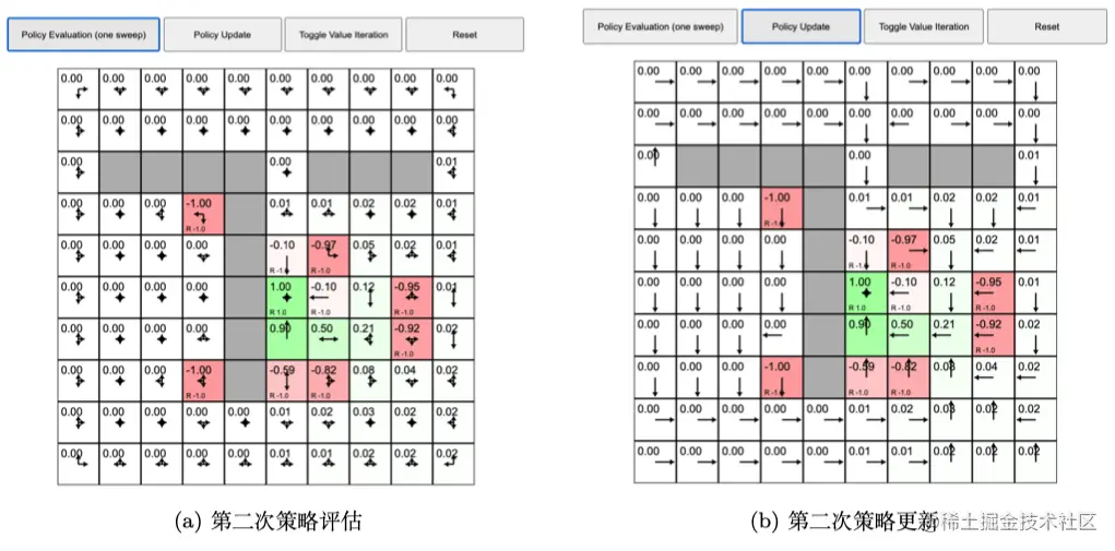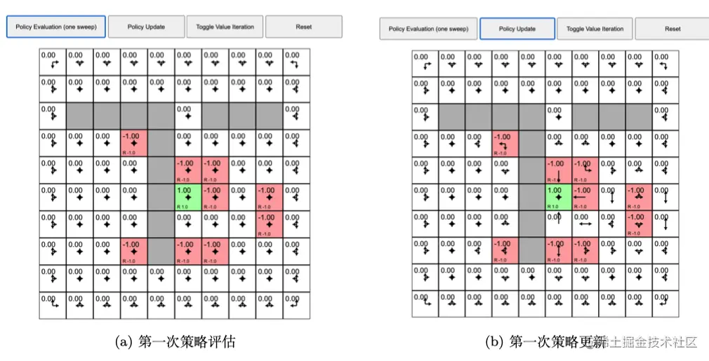 首先我们来看看策略迭代,之前的例子在每个状态都采取固定的随机策略,每个状态都以 0.25 的概率往上、下、左、右,没有策略的改变。但是我们现在想进行策略迭代,每个状态的策略都进行改变。如图 2.25a 所示,我们先执行一次策略评估,得到价值函数,每个状态都有一个价值函数。如图 2.25b 所示,我们接着进行策略改进,单击“策略更新(policy update)”,这时有些格子里面的策略已经产生变化。比如对于中间 − - − 1 的这个状态,它的最佳策略是往下走。当我们到达 − - − 1 状态后,我们应该往下走,这样就会得到最佳的价值。绿色右边的格子的策略也改变了,它现在选取的最佳策略是往左走,也就是在这个状态的时候,最佳策略应该是往左走。