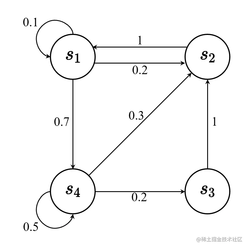 离散时间的马尔可夫过程也称为马尔可夫链(Markov chain) 。马尔可夫链是最简单的马尔可夫过程,其状态是有限的。例如,图 2.2 里面有4个状态,这4个状态在 s 1 , s 2 , s 3 , s 4 s_1,s_2,s_3,s_4 s 1 , s 2 , s 3 , s 4 之间互相转移。比如从 s 1 s_1 s 1 开始,s 1 s_1 s 1 有 0.1 的概率继续存留在 s 1 s_1 s 1 状态,有 0.2 的概率转移到 s 2 s_2 s 2 ,有 0.7 的概率转移到 s 4 s_4 s 4 。如果 s 4 s_4 s 4 是我们的当前状态,它有 0.3 的概率转移到 s 2 s_2 s 2 ,有 0.2 的概率转移到 s 3 s_3 s 3 ,有 0.5 的概率留在当前状态。