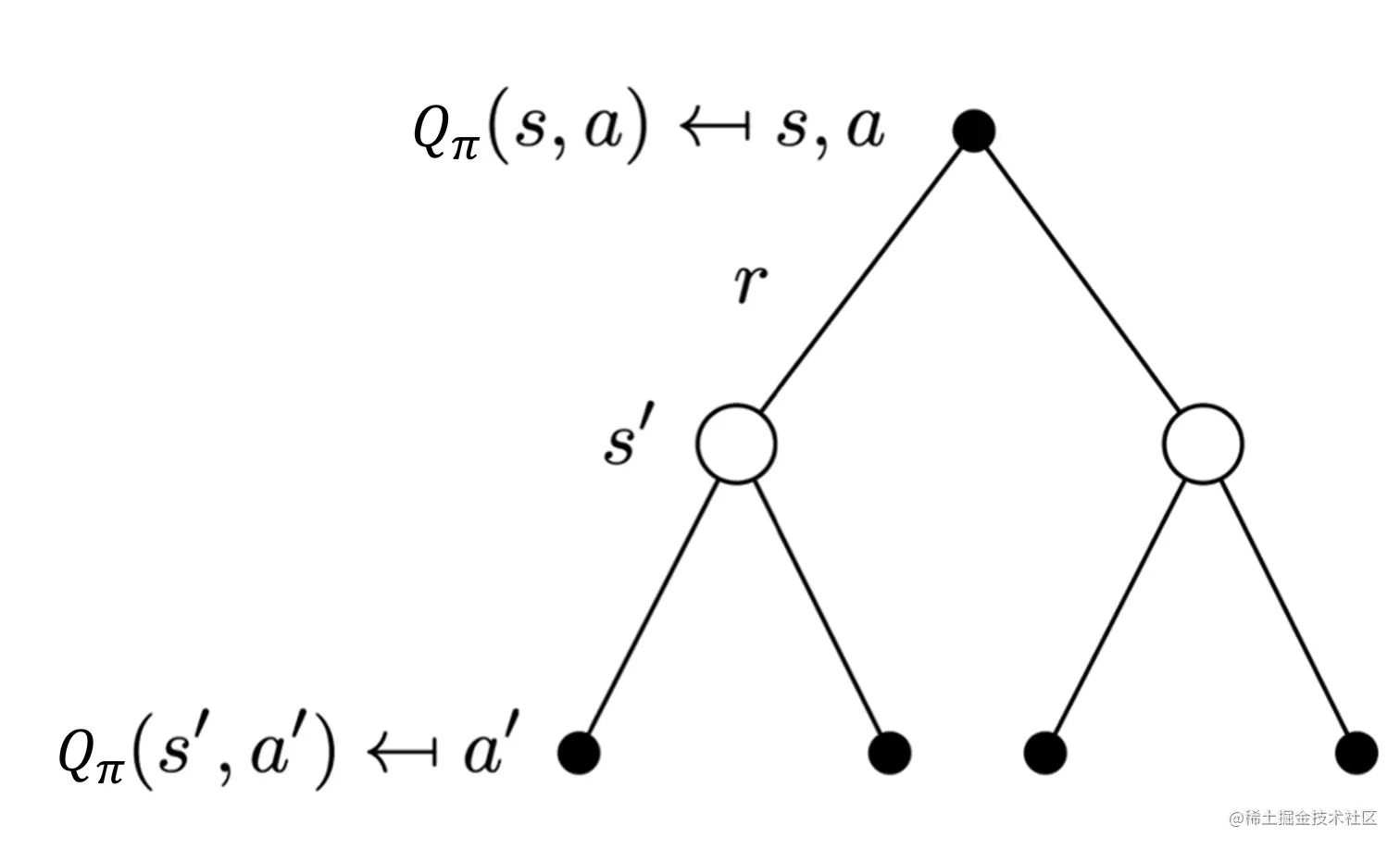 我们就可以得到 Q 函数之间的转移。Q学习是基于贝尔曼最优方程来进行的,当取Q函数值最大的状态( max a ′ Q ∗ ( s ′ , a ′ ) \underset{a'}{\max} Q^{*}\left(s^{\prime}, a^{\prime}\right) a ′ max Q ∗ ( s ′ , a ′ ) )的时候可得