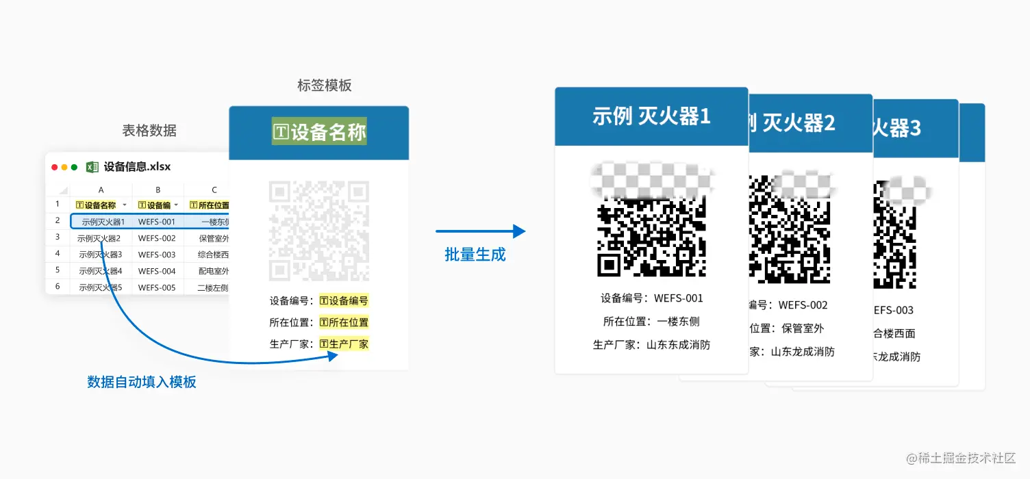 用“标签模板”+“大量数据”,即可生成一大批标签,包含在线表格批量制作、上传excel批量制作2种方式,应用后即可批量生成一批结构相同、内容不同的二维码标签。