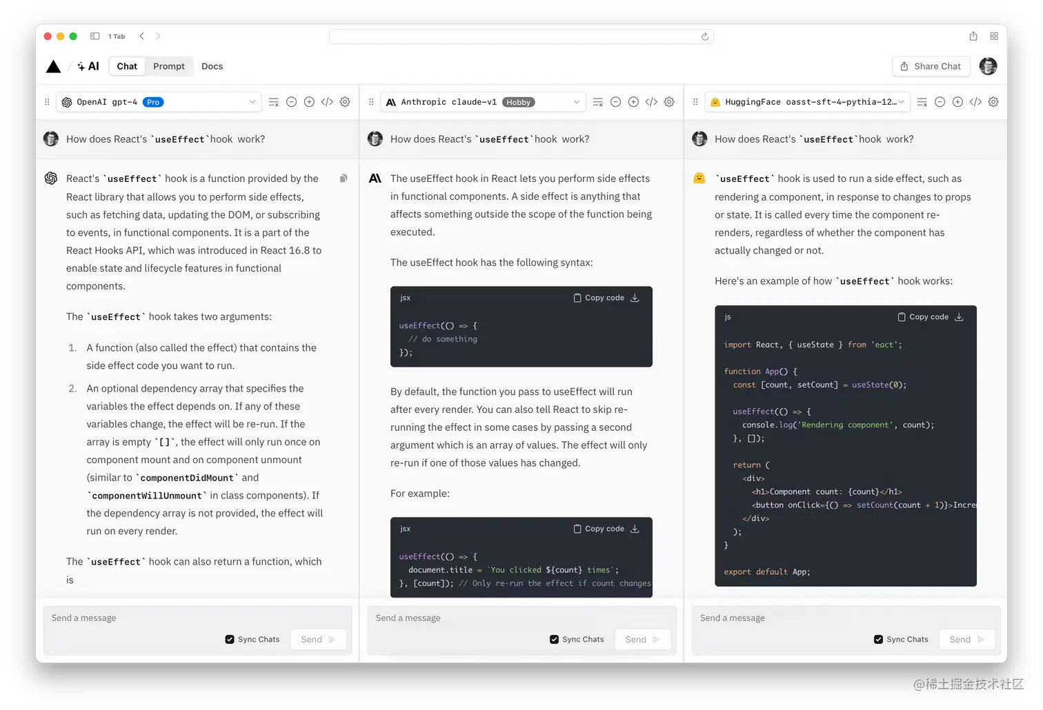 现在,在其中添加了一个新的聊天界面,以便可以同时比较并排显示聊天模型。除此之外,还为 Vercel AI SDK 添加了代码生成支持。现在,只需点击几下即可从 Playground 转到聊天应用。