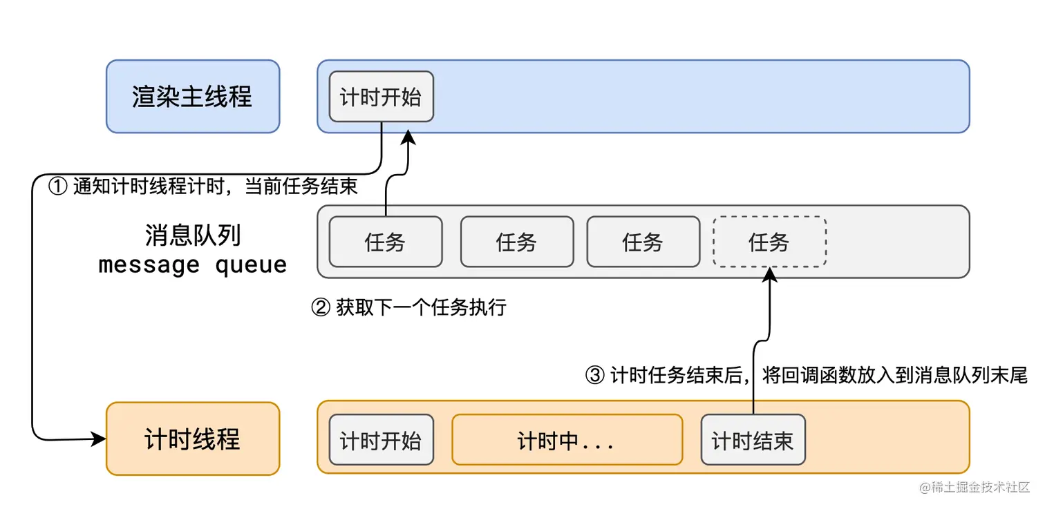 在 Chrome 的源码中,它开启一个不会结束的 for 循环,每次循环从消息队列中取出第一个任务执行,而其他线程只需要在合适的时候将任务加入到队列末尾即可。