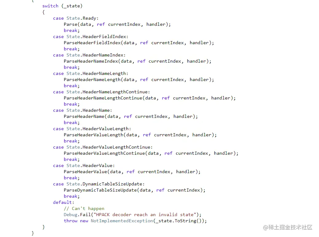 Decode解码方法中使用HPACK算法和状态机算法对HTTP/2请求头部进行解码。本篇文章中就不继续深究了......