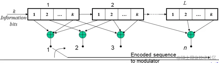 (n, k, L) 卷积码: 下图为卷积码的编码器, 其中有 kL 级 移位寄存器, 称为卷积码的约束长度。