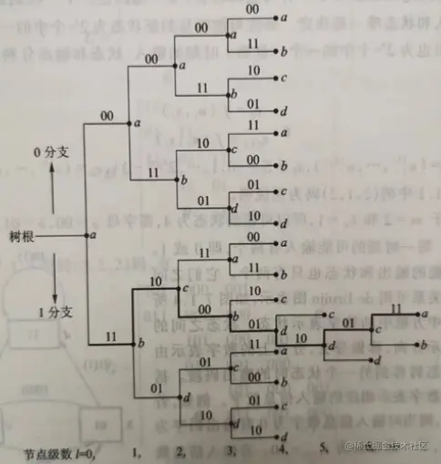 虽然状态图完全的描述了编码器的特性,但由于没有表示时间的过程,采用状态图跟踪编码器的状态转移很不方便。如果要展示出编码器输入、输出的所有可能情况,则可用树图描述。它是将编码器的状态图按时间展开而成的。